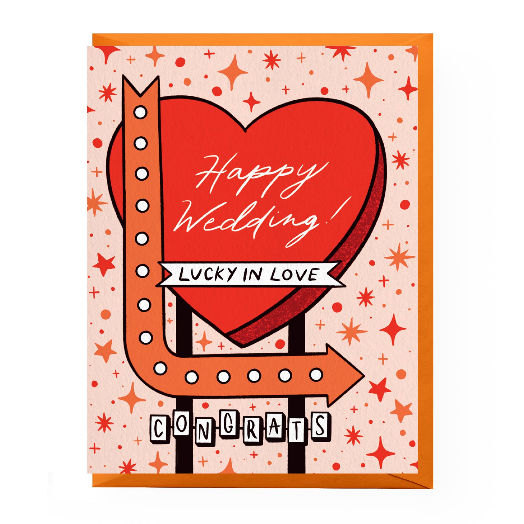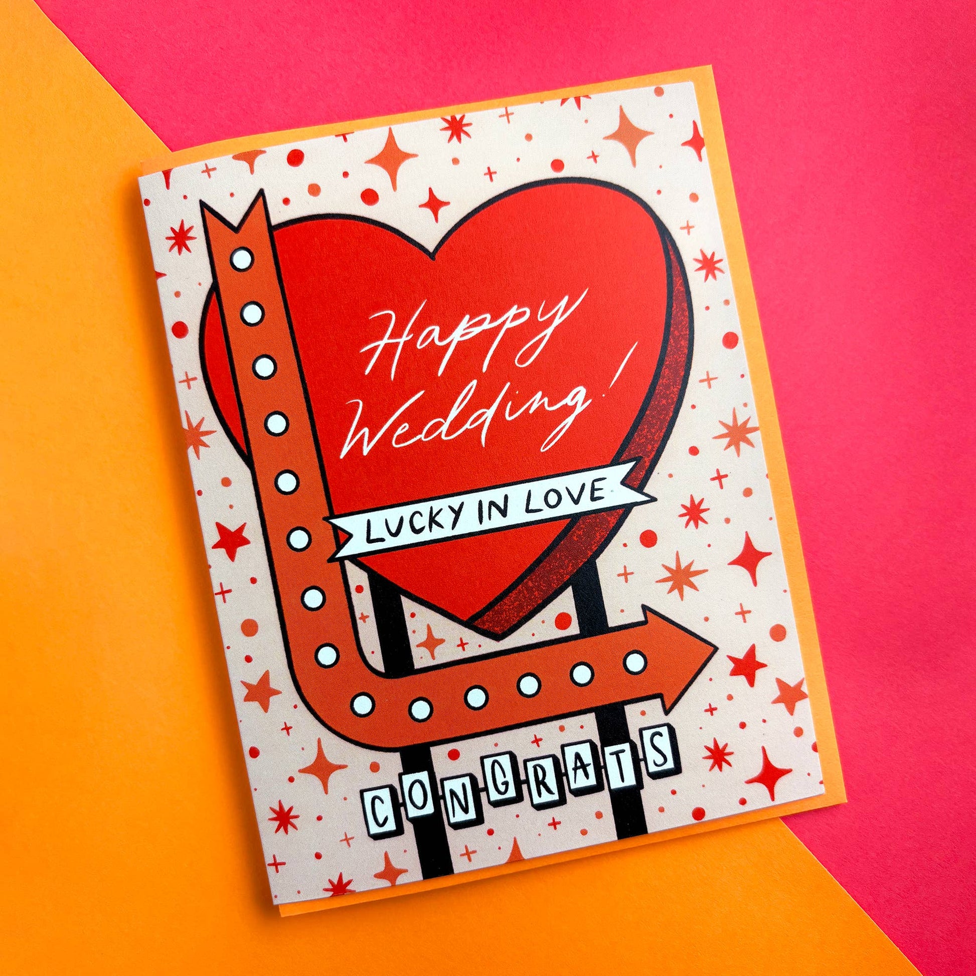 Card reads "Happy Wedding! / Lucky In Love / Congrats" on a series of Las Vegas-style street signs in red, peach and orange